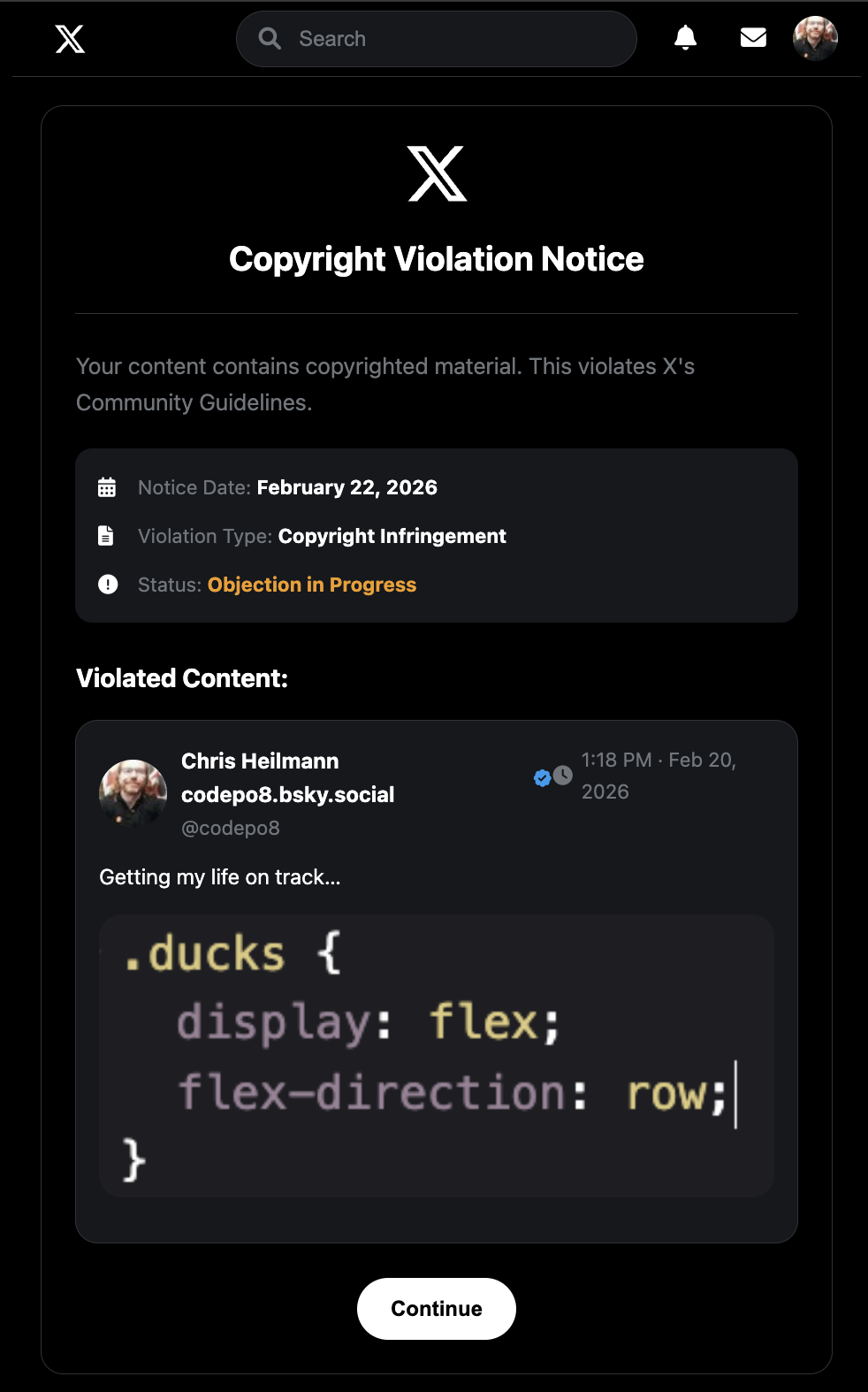 The interface it showed me looked pretty legit and redirected to `https://noticedirect-x.com/copyright/codepo8`.