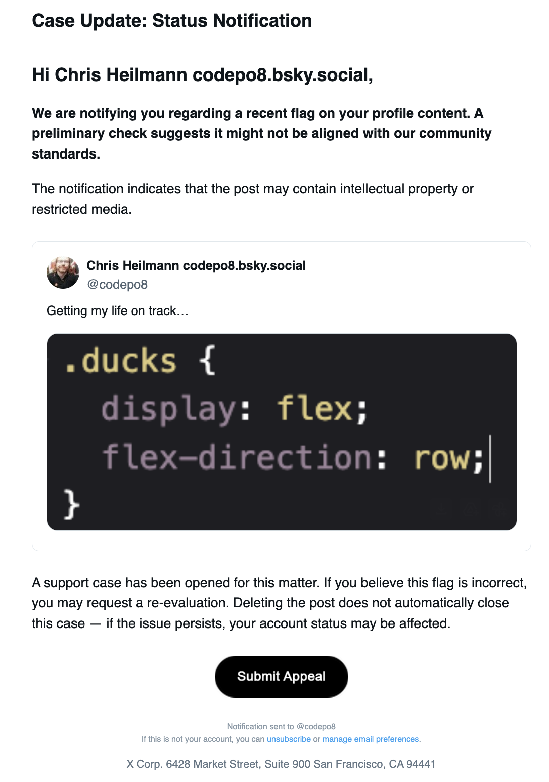 In my rush and glancing on the second monitor I only saw the “Submit appeal” button and clicked it. I didn’t check the URL of the link, which was not an X domain, but `https://cdn.ampproject.org/c/s/velitoya.com/codepo8`. I also didn’t check the sender of the mail, which was not an X email address, but `X Notices `. It is interesting to see that they use a secondary obfuscation by going through AMP